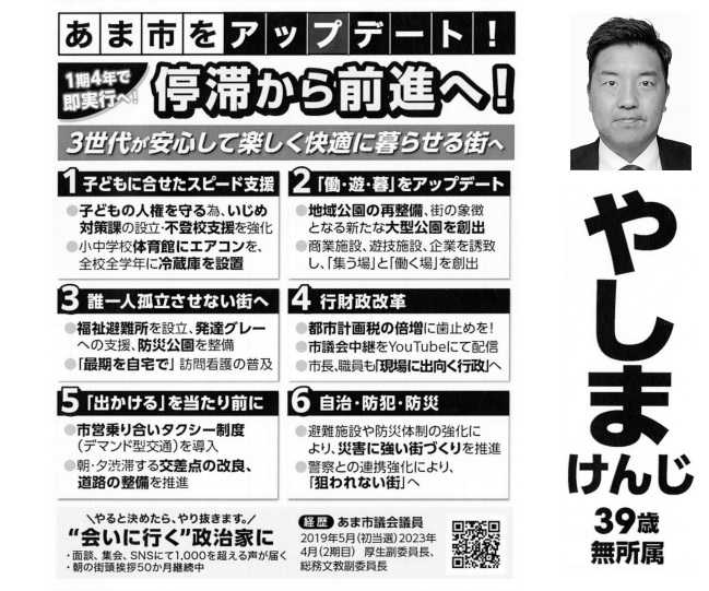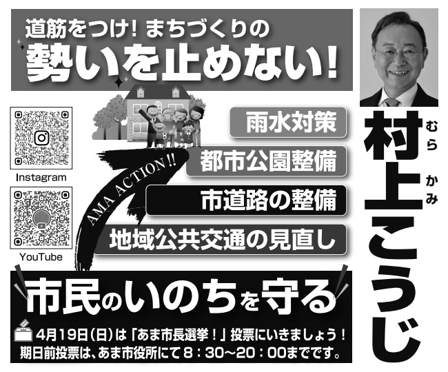 4月12日に告示されたあま市長選挙には、新人の八島堅志(やしま・けんじ)氏(39)、自由民主党・日本維新の会が推薦する現職の村上浩司(むらかみ・こうじ)氏(63)の無所属2名が立候補しました。投開票は4月19日に行われます。