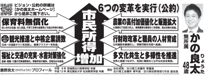 4月12日に告示された大崎市長選挙には、鹿野良太(かの・りょうた)氏(48)、高島健一(たかしま・けんいち)氏(67)、藤本勘寿(ふじもと・かんじゅ)氏(32)、中島源陽(なかじま・もとはる)氏(63)の無所属新人4名が立候補しました。投開票は4月19日に行われます。