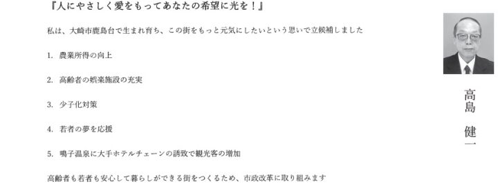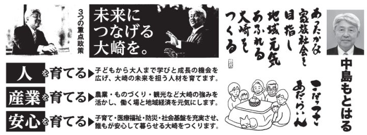中島氏は大崎市出身、宮城県農業短期大学(畜産)卒業。短大卒業後に就農し、水稲耕作と和牛繁殖を行っています。2003年から宮城県議会議員選挙で6期連続当選。今回の市長選挙に立候補するため、今年3月31日付で宮城県議会議員を辞職しました。