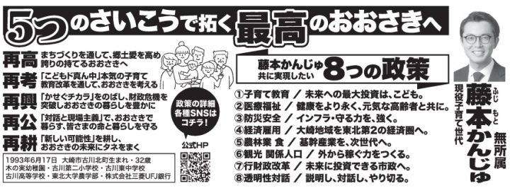 藤本氏は大崎市生まれ、東北大学農学部卒業。株式会社三菱UFJ銀行中野駅前支店勤務・本店東京公務部勤務を経て、2022年の大崎市議会議員選挙で初当選。今回の市長選挙に立候補するため、今年3月3日に辞職願を提出しました。