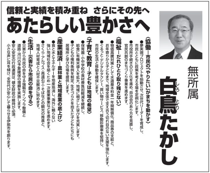 白鳥氏は伊那市生まれ、立教大学社会学部卒業。信英蓄電器箔株式会社を経て、伊那市収入役、伊那市副市長を歴任しました。2010年の伊那市長選挙で初当選、今回は5期連続当選を目指しての立候補となります。