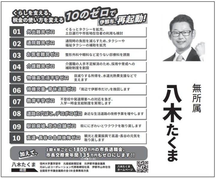 八木氏は大阪府堺市生まれ、信州大学農学部卒業。産経新聞社を経て、伊那市内で居酒屋「はしば」を開業。現在は株式会社はしばコーポレーションの代表取締役を務めています。2014年の伊那市議会議員選挙で初当選し1期務めました。伊那市長選挙は2018年・2022年に続き3度目の挑戦となります。
