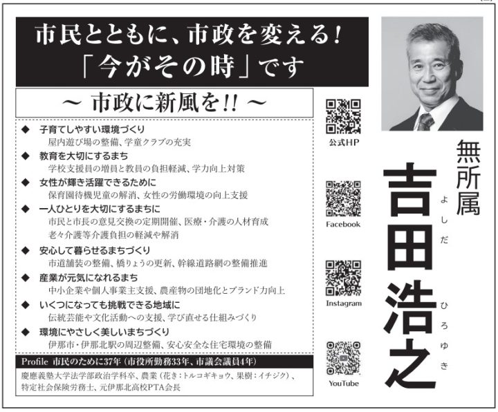 吉田氏は伊那市生まれ、慶応義塾大学法学部政治学科卒業。伊那市に入庁し、行政改革推進室長、秘書広報課長、企画情報統計課長、危機管理課長、子育て支援課長、伊那市教育委員会学校教育課長を歴任しました。2022年の伊那市議会議員選挙で初当選し、昨年9月30日付で辞職しました。