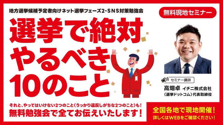 【政治家・関係者向け】「選挙で絶対やるべき10のこと」ネット選挙フェーズ2・SNS対策勉強会を2026年4月~5月に全国で開催!