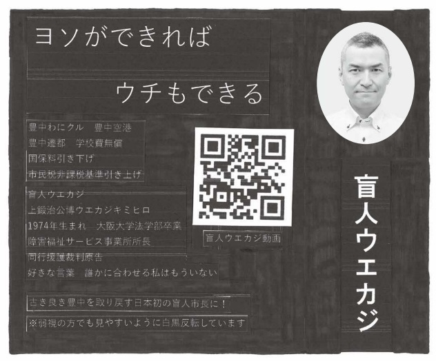 4月12日に告示された豊中市長選挙には、無所属新人の盲人ウエカジ(もうじん・うえかじ)氏(51)、大阪維新の会新人の市橋拓(いちはし・ひろし)氏(38)、自由民主党・国民民主党・立憲民主党・公明党が推薦する無所属現職の長内繁樹(おさない・しげき)氏(67)、無所属新人の中野宏基(なかの・こうき)氏(44)の4名が立候補しました。投開票は4月19日に行われます。