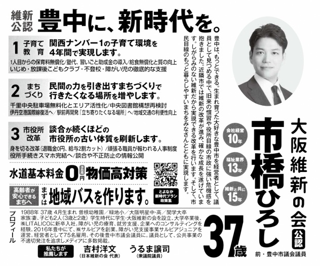 市橋氏は豊中市生まれ、関西学院大学法学部卒業。東京で株式会社LITALICO勤務を経て、豊中市にUターンし株式会社サルビアを創業しました。2023年の豊中市議会議員選挙で初当選し、今回の市長選挙に立候補するため2月20日付で豊中市議会議員を辞職しました。