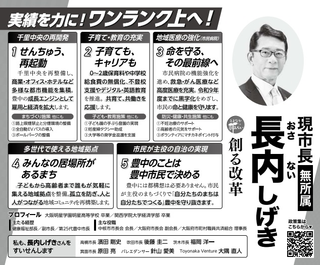 長内氏は関西学院大学経済学部卒業。豊中市に入庁し、健康福祉部福祉事務所高齢介護課長、健康福祉部次長 兼 地域福祉課長、健康福祉部長、豊中市副市長を歴任しました。2018年の豊中市長選挙で初当選、今回は3期連続当選を目指しての立候補となります。