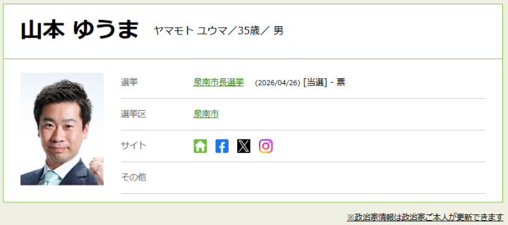 大阪府泉南市長選挙が4月19日に告示され、現職の山本優真(やまもと・ゆうま)氏(35)のほかに立候補の届け出がなかったため山本氏が無投票で再選しました。