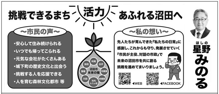 星野氏は国士舘大学政経学部二部政治学科卒業。2003年から沼田市議会議員選挙で5期連続当選しました。2022年の沼田市長選挙で初当選、今回は2期連続当選を目指しての立候補となります。