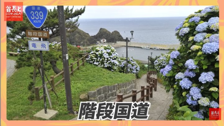 津軽半島最北端の龍飛崎があり、ここを通る国道339号は日本で唯一の階段国道です。362段の階段で、国道にもかかわらず車が通行できません。夏にはアジサイが咲き誇る外ヶ浜町の観光スポットです。