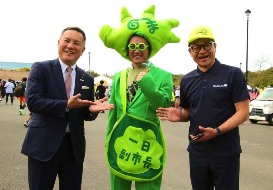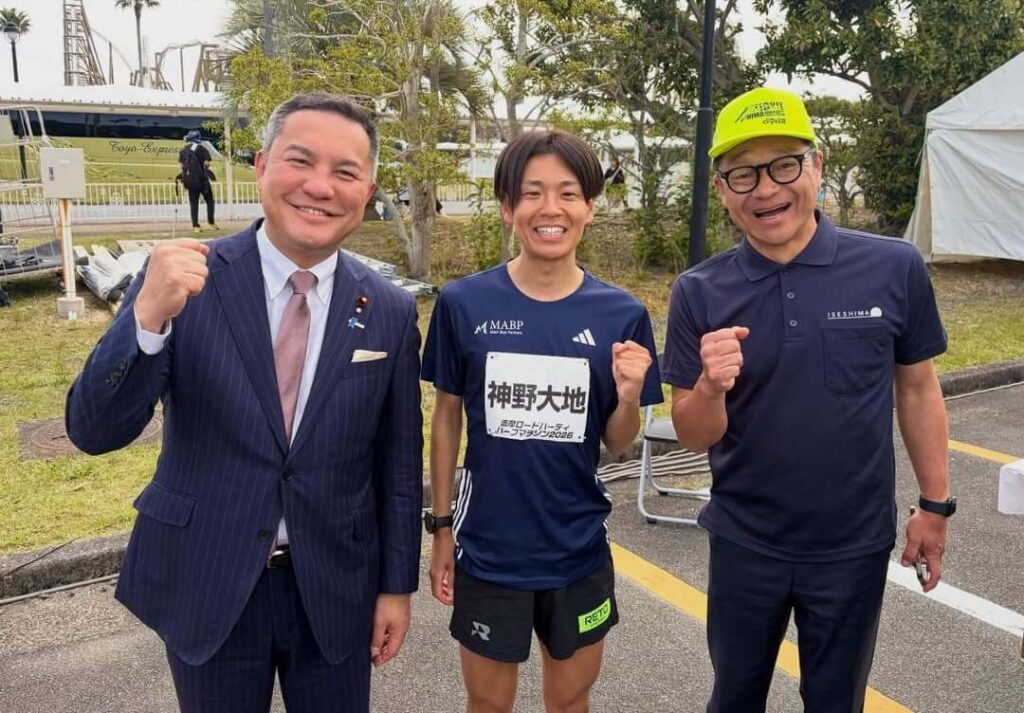 「努力で結果が出る競技ですよ」。「三代目山の神」と言われた青学出身の神野大地さん。志摩ロードパーティハーフマラソンのゲストでお越しいただき、陸上をやっている息子へのアドバイスをとお願いしたら冒頭のお言葉。この日は4300名の参加。春の志摩路を満喫していただきました。志摩市の村上副市長がコスプレで参加。表彰式でご挨拶とプレゼンテーター。
