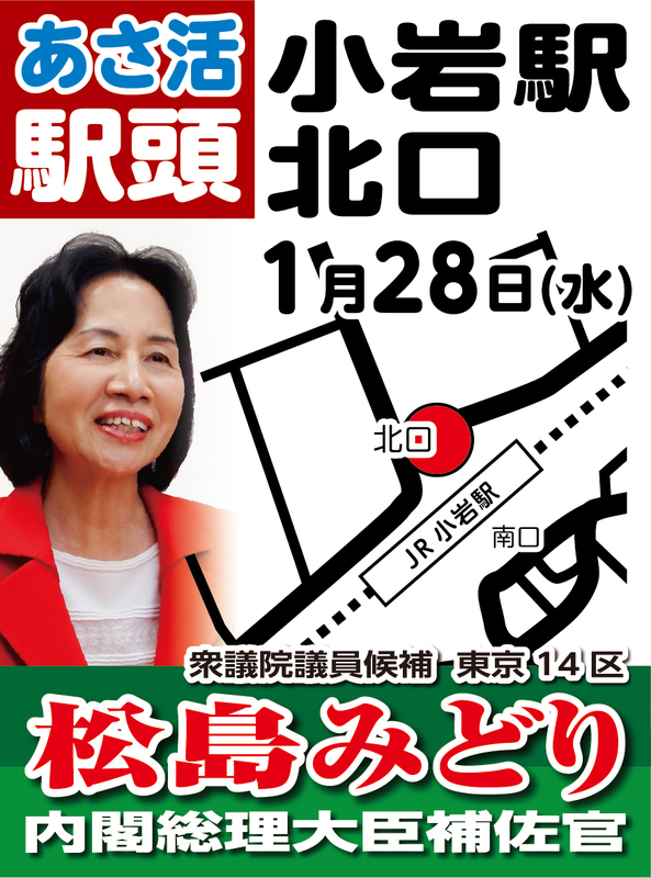 ホーム>政党・政治家>松島 みどり (マツシマ ミドリ)>1/28(水)朝は、小岩駅北口でのご挨拶よりスタートします。