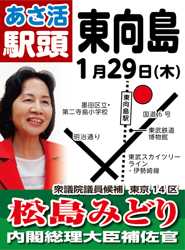 ホーム>政党・政治家>松島 みどり (マツシマ ミドリ)>1/29(木)朝は、東向島駅でのご挨拶よりスタートします。