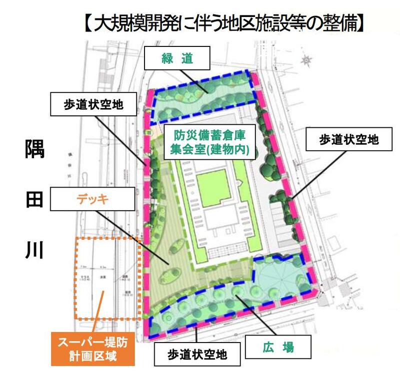 この再開発は、跡地になるマンション事業者が住民以外も憩える公園(スペース)を提供することで、高さ制限も28mから91.4mに容積率が300%から500%に緩和されました。地上26階、高さ約90m、およそ460戸のタワーマンション建設が計画されています。地上1階部分は、首都高向島線の下の区道である「国技館通り」の高さで、国技館通りの上に30mにわたりデッキを造り、隅田川の堤防と繋げます。これにより川のすぐそばまで、歩ける緑地スペースが広がることになります。1階部分は、防災備蓄倉庫や集会室に、デッキとつながる2階部分は駐輪場や商業施設が入る予定です。