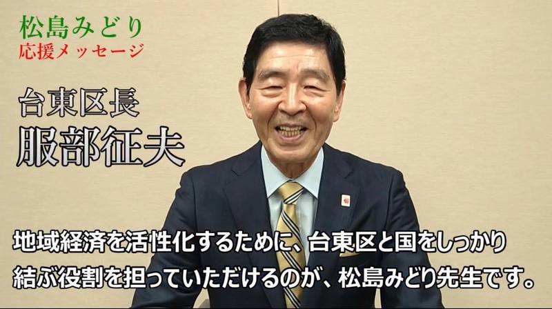ホーム>政党・政治家>松島 みどり (マツシマ ミドリ)>松島みどりの【応援団】服部征夫台東区長こんにちは。