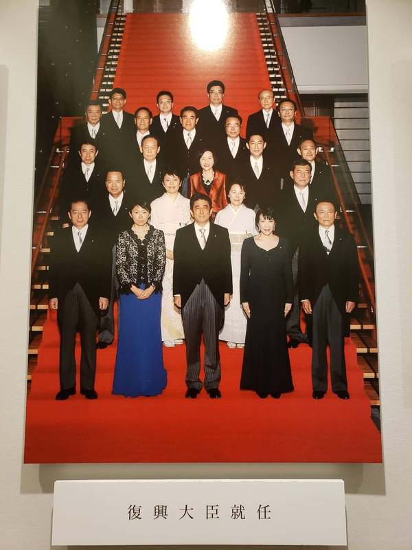 竹下さんが復興大臣になった時の記念写真(官邸階段)を前に、安倍さんが「ここに写ってるね」。最前列中央はもちろん安倍総理で、その後ろには赤いドレスの私の姿(法務大臣)もあったのです。