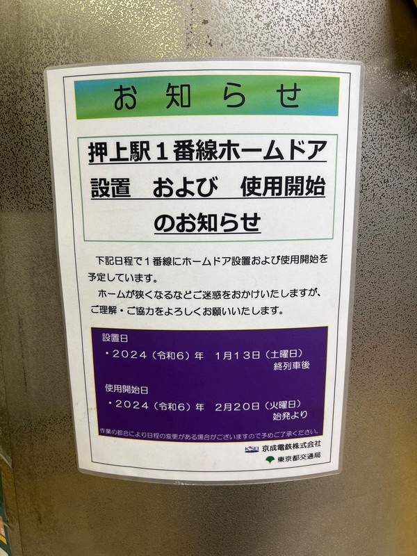 あす20日(火)始発から、都営・京成押上駅1番線(都営浅草線の浅草・西馬込方面、京急線の品川・羽田空港方面)ホームのホームドアが運用開始します。