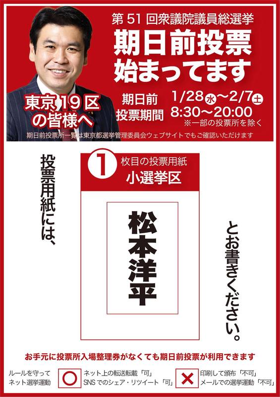 ホーム>政党・政治家>松本 洋平 (マツモト ヨウヘイ)>【期日前投票所が増えました!📣】【松本洋平】文部科学大臣衆議院議員候補東京19区(小平市・国分...