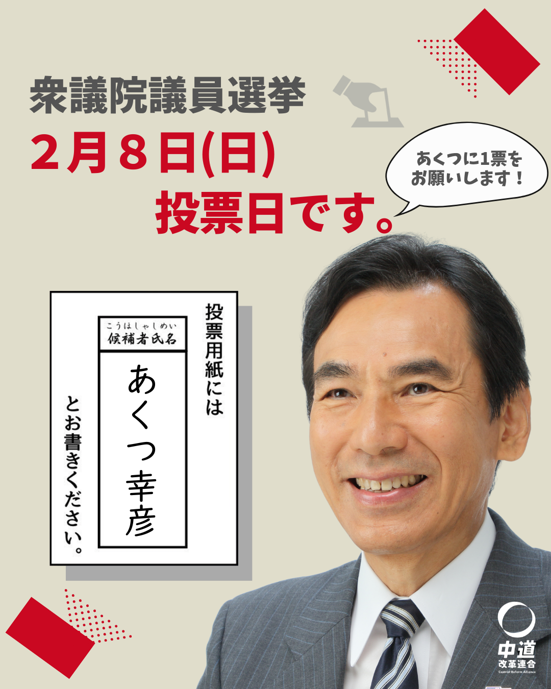ホーム>政党・政治家>あくつ 幸彦 (アクツ ユキヒコ)>あしたは投票日です。