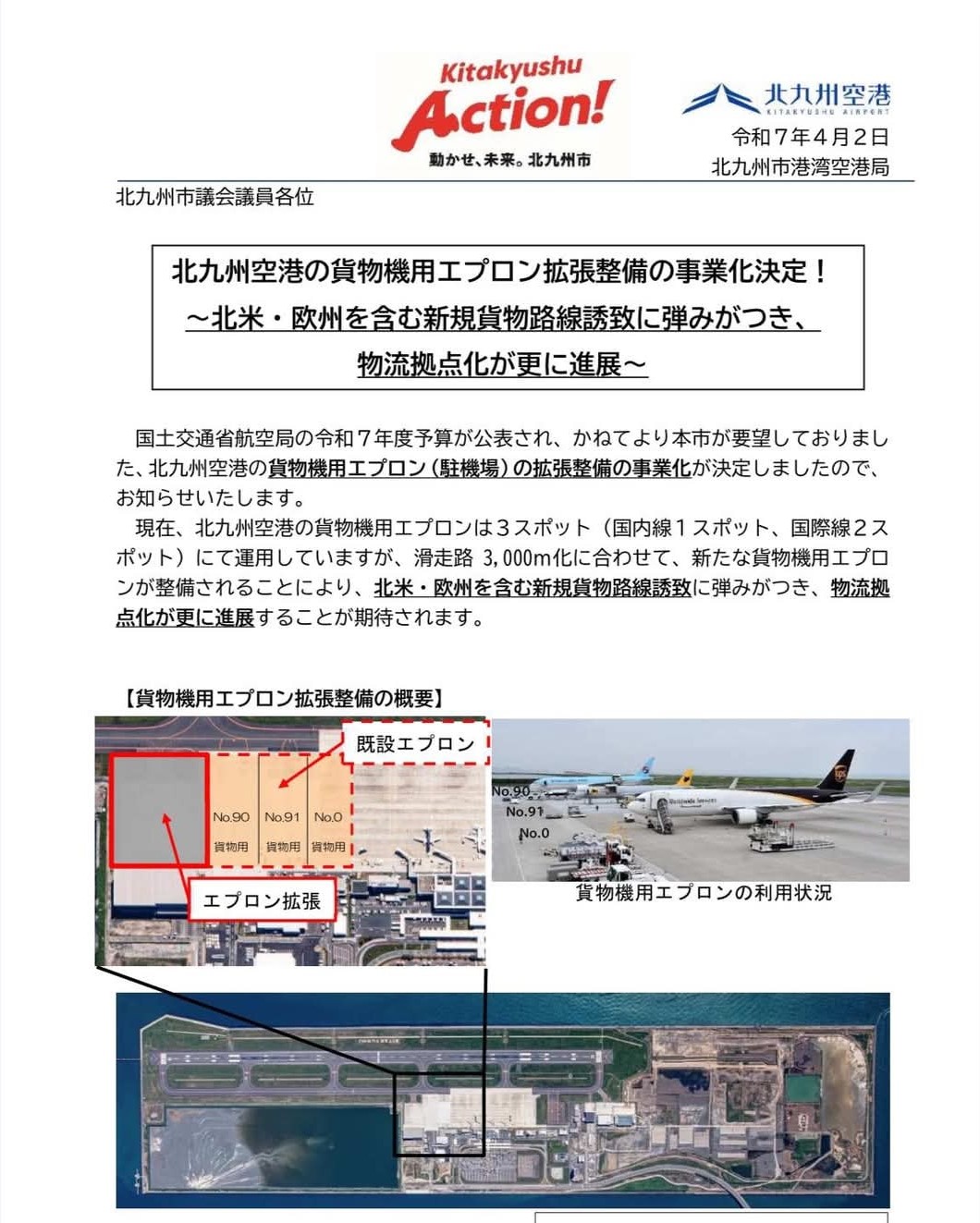 北九州市の要望に基づいて委員会質疑や質問主意書で私が取り上げてきた、北九州空港の貨物機用エプロン拡張整備の事業化が令和7年度予算に盛り込まれ、ついに決定しました。