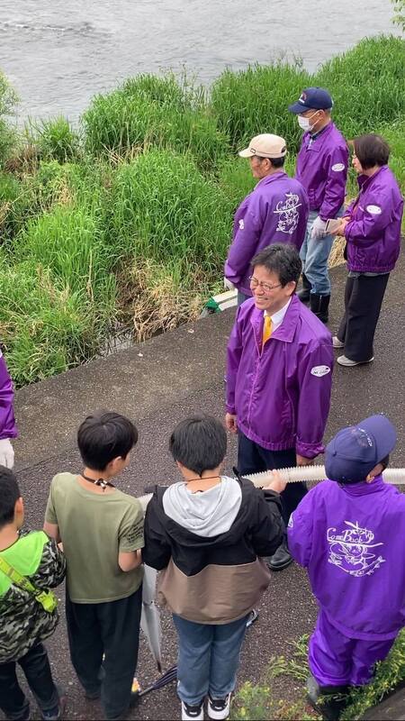 4月18日、紫川沿いで鮎の放流が行われる中、今町校区で鮎の放流祭が開催されました。