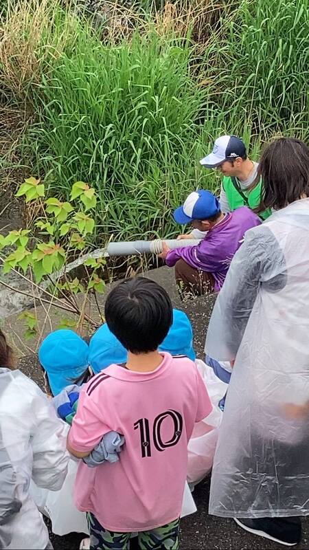 お天気の都合でホースからの放流となりました。子どもたちも興味津々です。