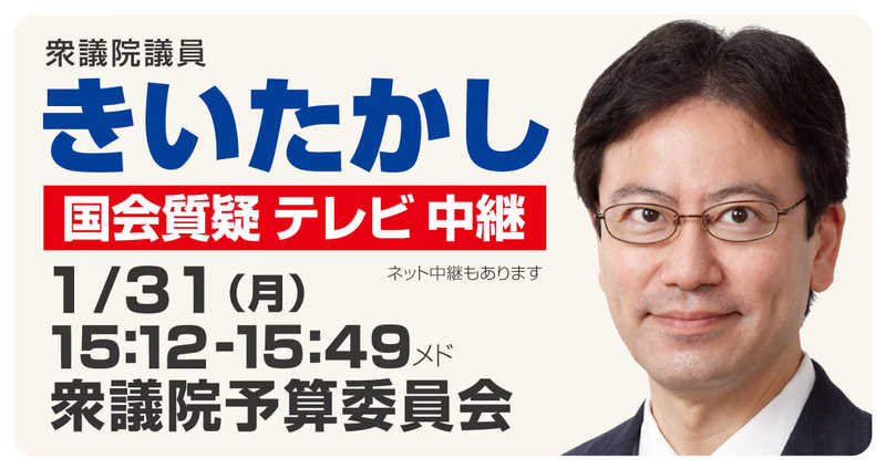 ホーム>政党・政治家>きい たかし (キイ タカシ)>1月31日予算委員会質疑(テレビ中継あり)に立ちます。