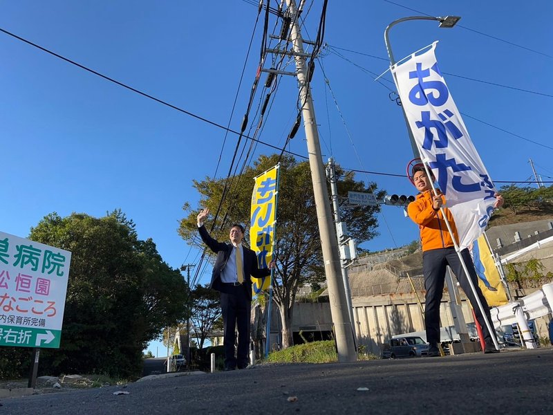 早朝に、福岡県議選・門司区での立憲民主党公認内定が決まっている「おがたふみのり」さんと松ヶ江南地区で朝のご挨拶に立ちました。たくさんの応援激励に感謝します。特に通学中の小学生の元気な挨拶が好印象でした。