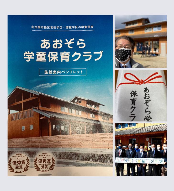 名古屋市緑区常安学区・徳重学区の学童保育所は昨年、木造で建てられオープン。保護者の皆様を中心にクラウドファンディングなどで資金を調達し、全国注目のプロジェクトとなった施設です。「脱炭素チャレンジカッピング2021」や「あいち木づかい表彰」の優秀賞をダブル受賞したこともあり、視察が絶えない施設になっており(写真右下は愛知県知事の視察写真)、木の香りが漂う空間で、瞳を輝かす子どもたちの笑顔が映えています。