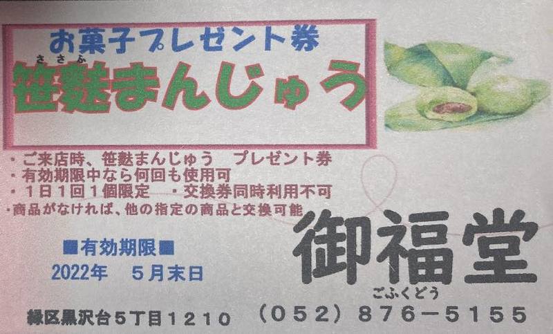 私・岡明彦の地元、名古屋市緑区徳重エリアにある和菓子屋・御福堂さんです。このお菓子プレゼント券の写真を見せるだけで表記のプレゼントをして頂けるとのことです。