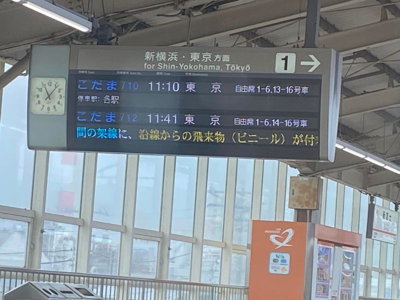 党大会出席のため東京に向かっていますが、乗車している新幹線が新富士駅で臨時停車。 新横浜〜小田原間の架線にビニールが付着している模様。
