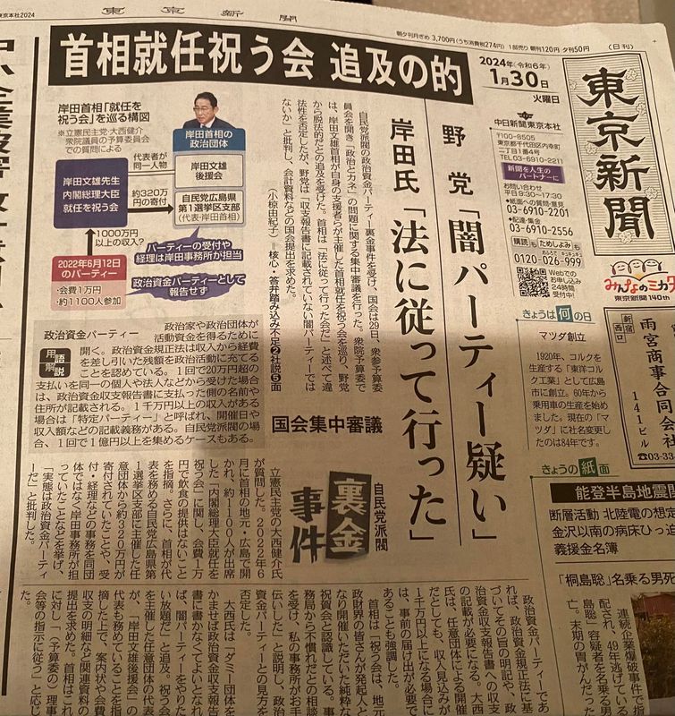 昨日の予算委員会で私が質問した「総理大臣就任を祝う会」を東京新聞が一面トップで大きくとりあげています。