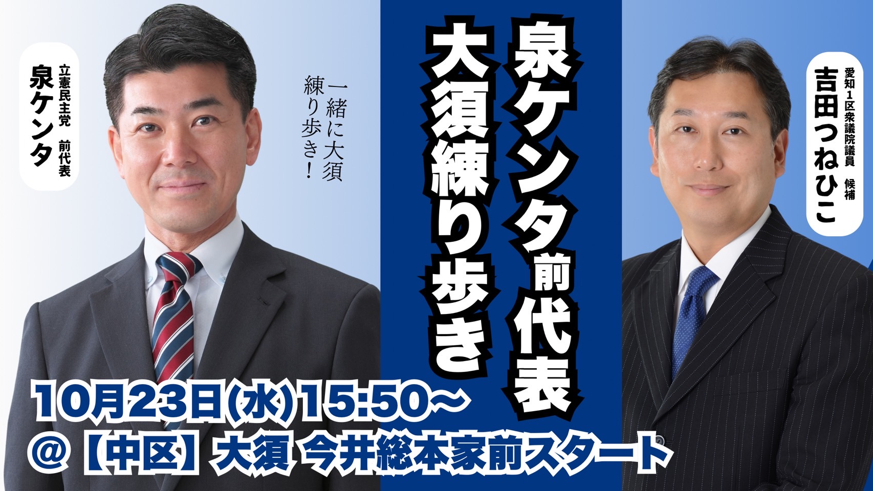 本日、10月23日、立憲民主党常任顧問の泉ケンタ前代表が愛知1区に入り、私、吉田つねひこの応援に共に大須商店街を練り歩きいただく予定です。