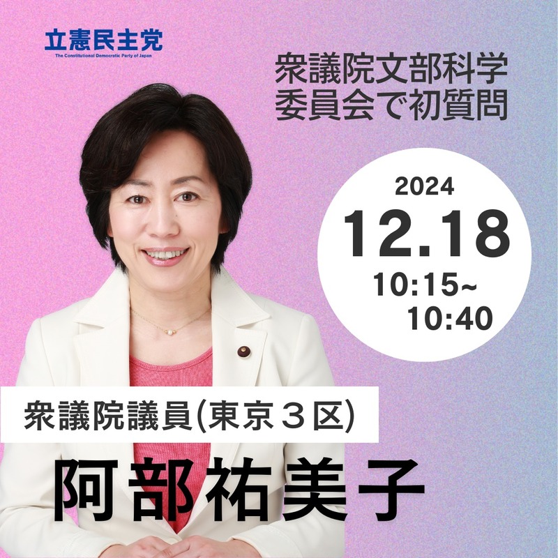 ホーム>政党・政治家>あべ 祐美子 (アベ ユミコ)>衆議院文部科学委員会で質問に立ちます。