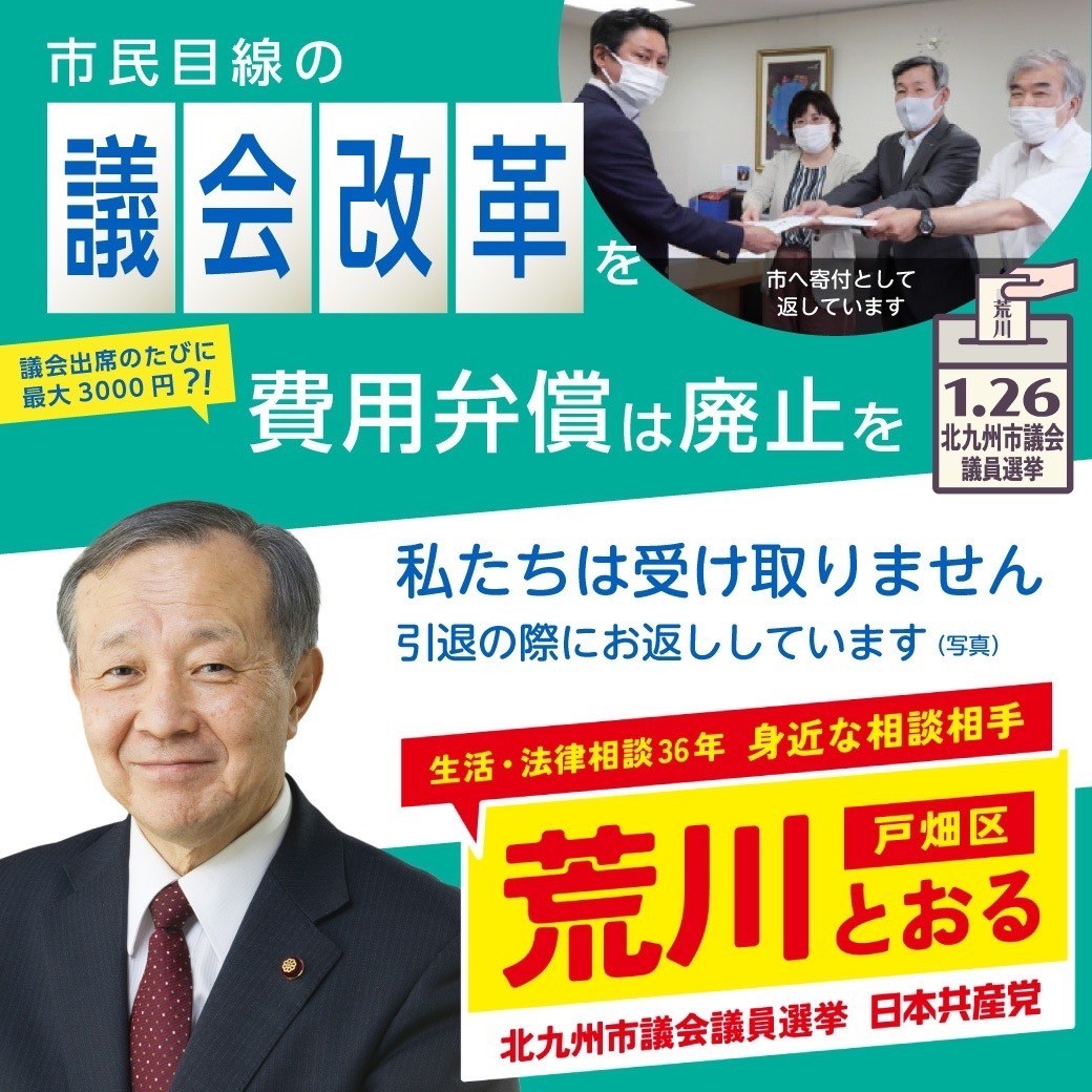 ホーム>政党・政治家>荒川 徹 (アラカワ トオル)>「議会出席のたびに最大3000円?!(=費用弁償)」日本共産党だけが受け取らず、市へ返還しています。