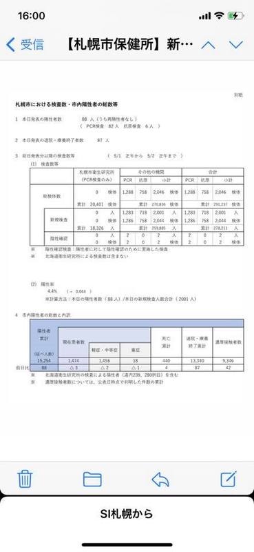 陽性率4.4%😌陽性者88人.退院・療養終了者87人、現在患者数1,474人。市内コンサルタント会社で226例目7人(40から60歳代)、医療機関24人(40から90歳代)227例目の集団感染事例が確認されました。60.80歳代女性、70歳代男性2人が亡くなられました。ご冥福をお祈りいたします。