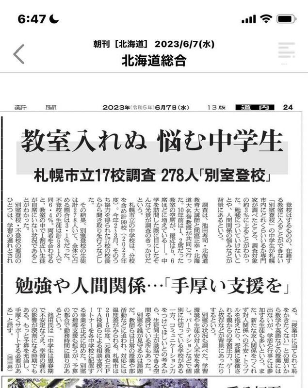 ホーム>政党・政治家>しのだ 江里子 (シノダ エリコ)>今朝の朝日新聞24面道内面から専門家による調査で「別室登校」中学生は約3.1%、勉強についてい...