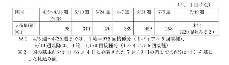 国からのファイザー社製のワクチンの供給量は次のとおりとなっており、7 月 5 日の週以降は、減少する見通しです。また、7 月 19 日の週以降の供給量は示されていません。