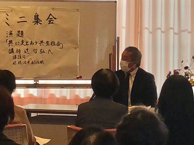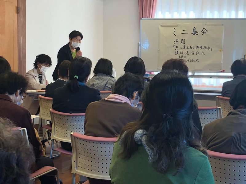 厚生保護女性会のミニ集会に参加しました。 講師は、浄土真宗大谷派 辻徳法寺副住職 辻哲弘氏です。「共に支え合う共生社会」と題しての講演です。