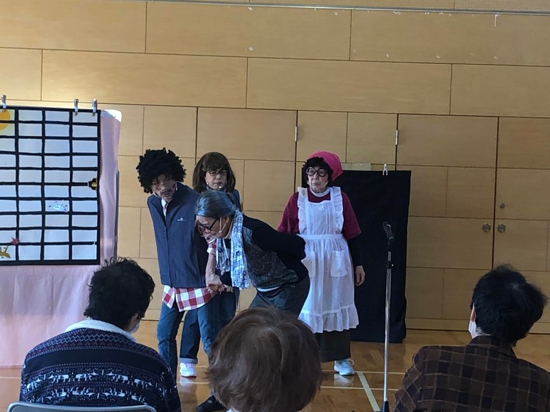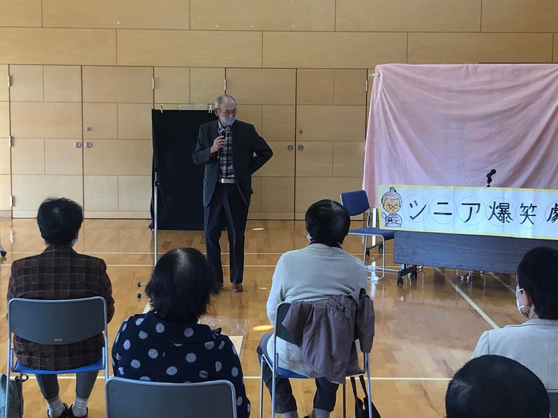 認知症サポーター養成講座を見学しています。 シニア爆笑劇団の皆さんの、日頃の何気ない光景からの啓発演技を、参加者は腹を抱えて笑いながら観ています。