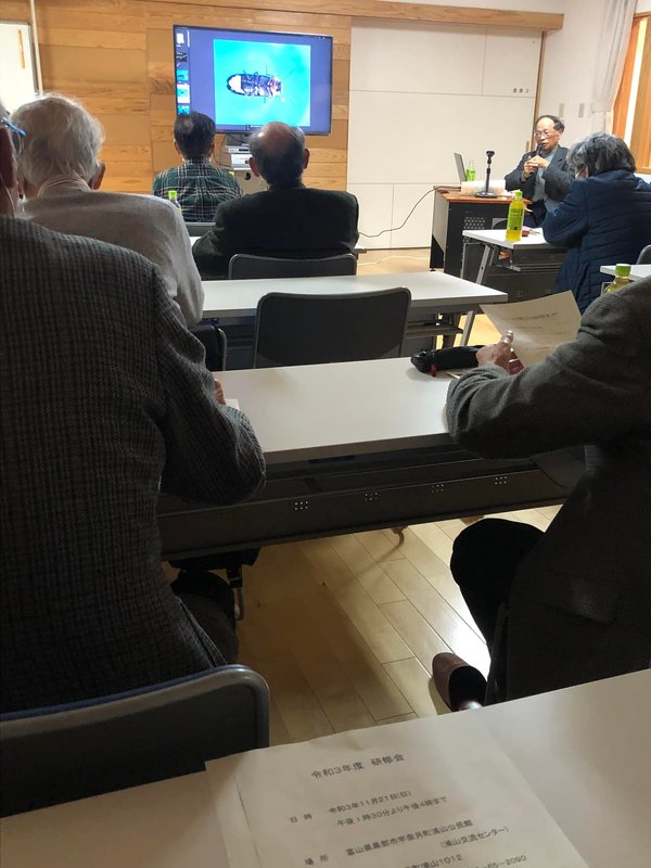富山県ホタルの会研修会が開催されています。 研究発表は、会の常任幹事 中毅士氏「ホタル成虫の吸飲とホタルの成虫の摂食行動」と題して、生態をビデオ撮影された映像を通して発表されています。