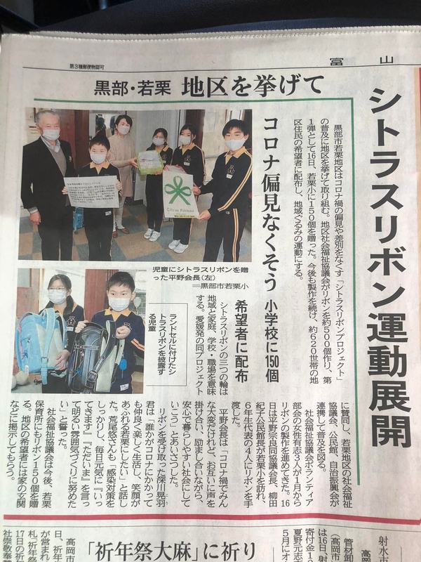 地元若栗地区社会福祉協議会のシトラスリボン運動が話題となっていました。 コロナ禍による偏見や差別をなくそうとする活動のシンボルマークです。 早く収まってほしいものです‼️