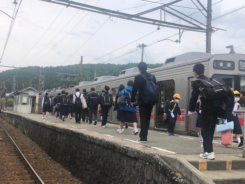 地元駅7:28発、中高生の通学列車となっています。ほぼ満員となり、次駅、次次駅、、とさらに混んでいきます。 一本前の7:15発は比較的に空いています。密を避けるためにも分散できないでしょうかね?