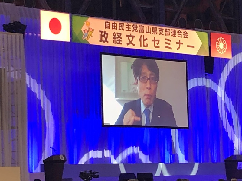 政経文化セミナーも参議院選圧倒的勝利を誓い合う頑張ろーへ 安達青年局長が力強く主唱しました。 引き続き講演会 竹田恒泰氏でしたが、コロナ感染陽性となり、リモート講演となりました。