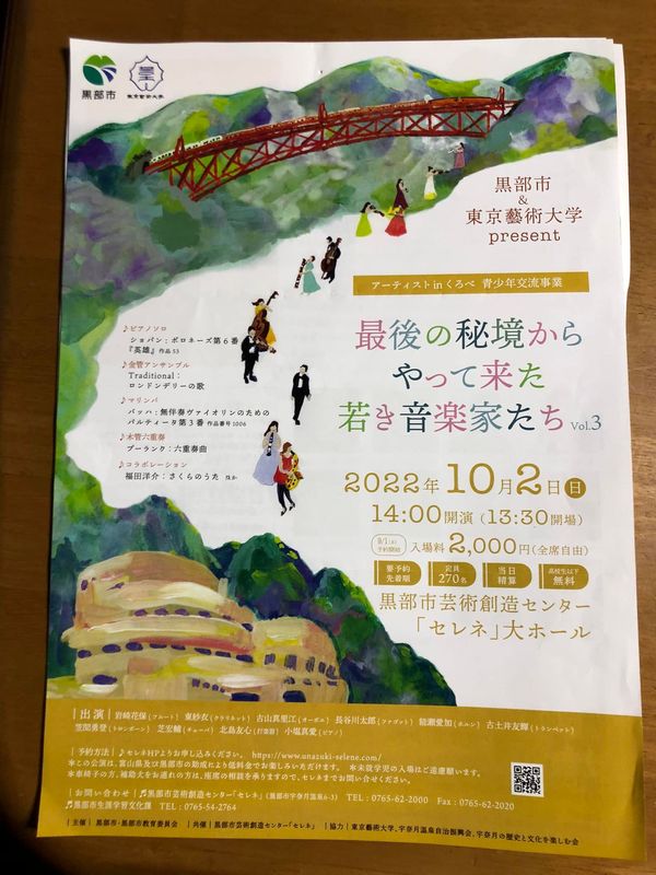 黒部市と東京芸大のコラボによる音楽会が宇奈月温泉、セレネで開催されました。大演奏家の卵たちの演奏に聴き入りました。 昨日は、トロッコ電車の終点、欅平駅前で演奏されました。 地元中学生とのアンサンブルもあり、思い出深いものとなった事でしょう。