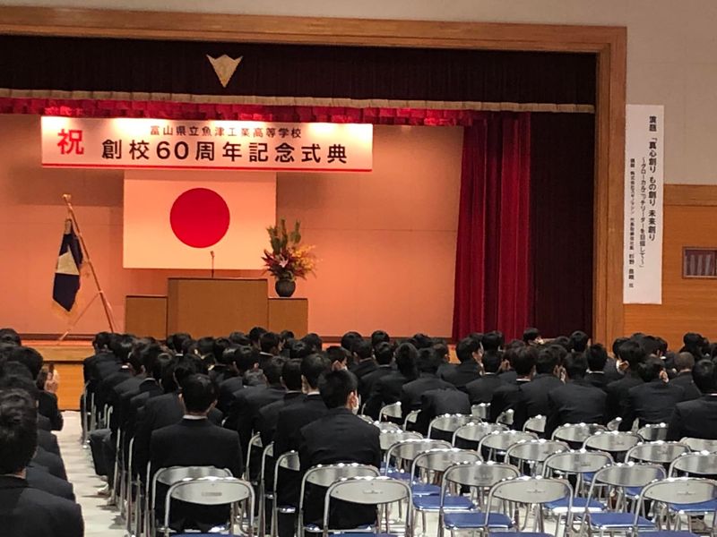 魚津工業高校創校60周年記念式典に参加してきました。 昭和37年、産業都市を目指す富山県が、県東部地区に工業人材を育成するために、魚津高校から独立させ開校しました。
