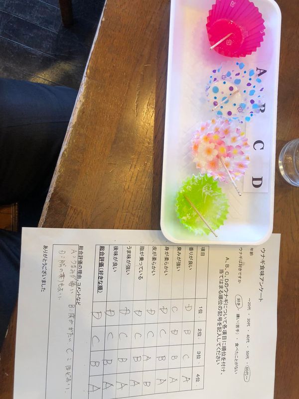 ウナギ食味会に来ています。 温泉水に2週間、1週間、1週間と柚子入り、地下水の4種類の食味会です。 分かったような、分からないような、、、 私の評価は⁉︎