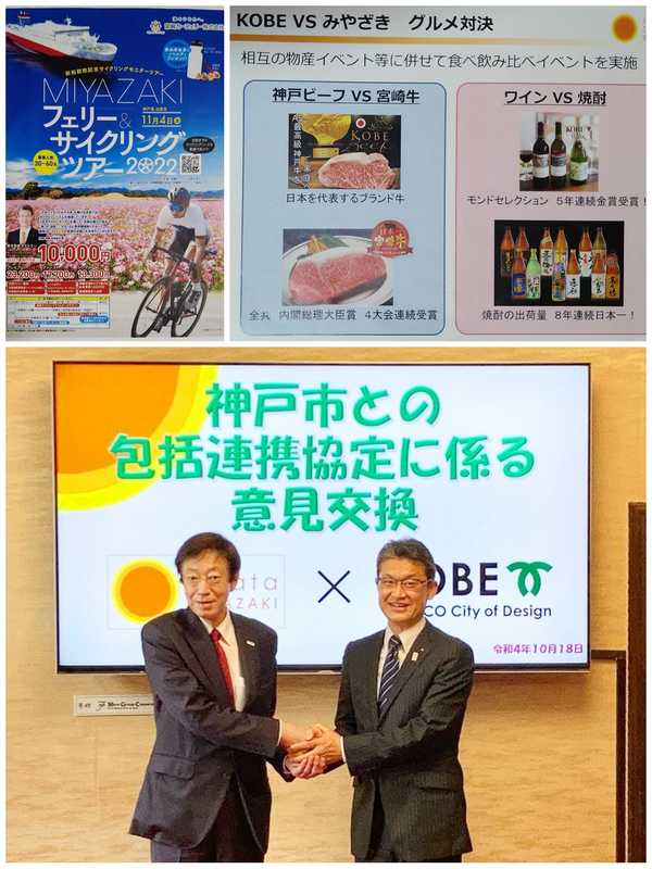 本県からは、おいしさ日本一の〈宮崎牛vs神戸ビーフ〉や日本一の出荷量〈宮崎の本格焼酎vs神戸ワイン〉といった食べ飲み比べイベントや、スポーツ・文化交流などを提案しました。