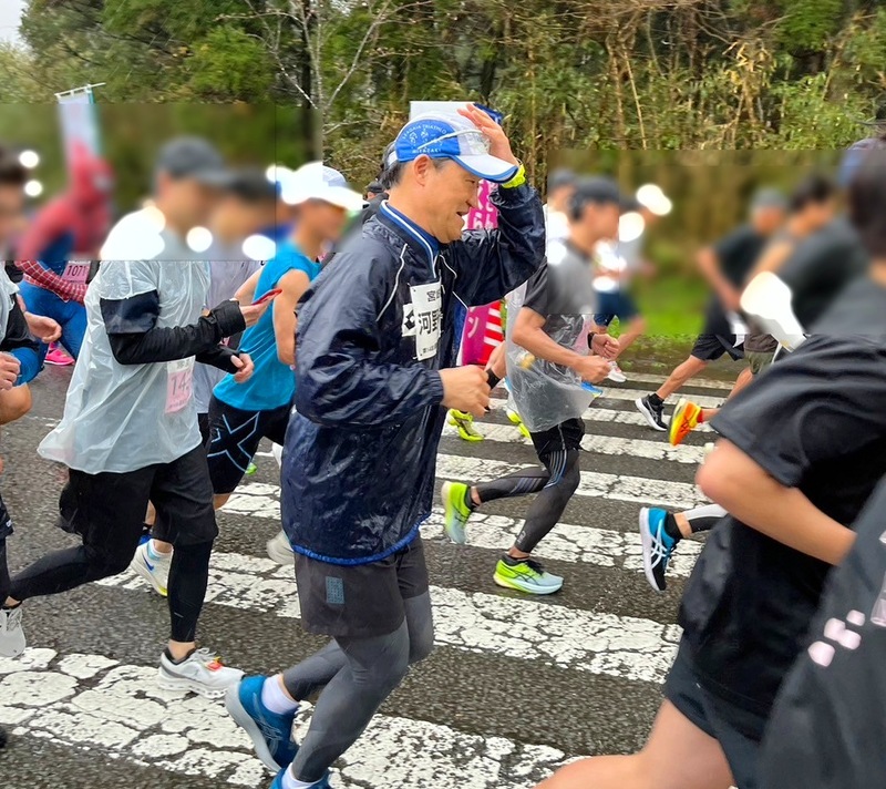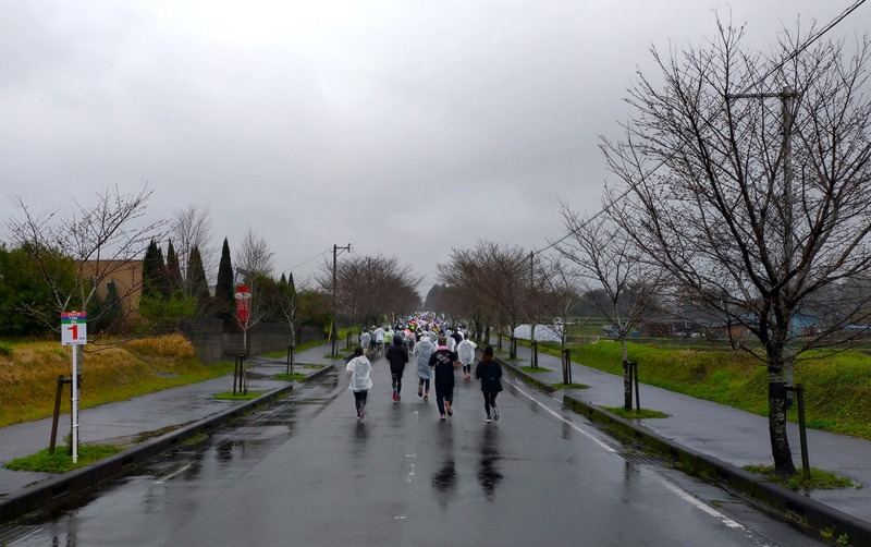 朝からまともに雨が降り続く天候となったものの、寒さはさほどでもありません。ビニール合羽などそれぞれの雨対策をしながら、大勢のランナーが駆け抜けていきました。私は、体を冷やさないよう、このような大会では初めてウィンドブレーカーを着用してのラン。