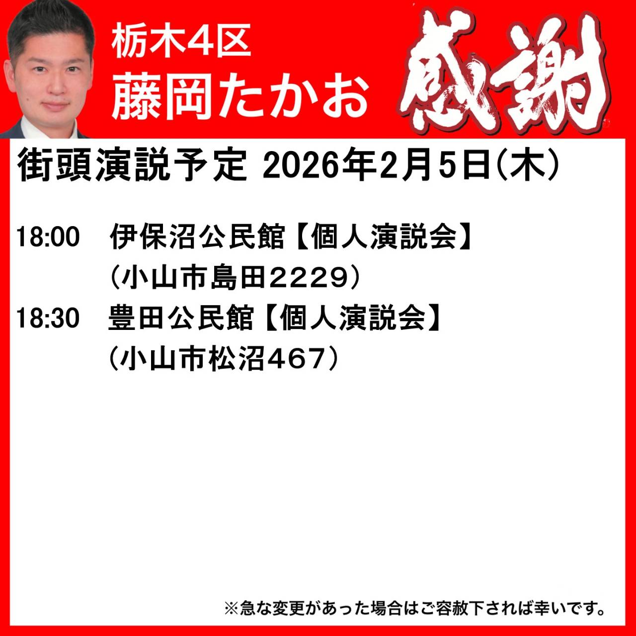 ホーム>政党・政治家>藤岡 たかお (フジオカ タカオ)>2月5日(金)街頭演説等の日程です!!